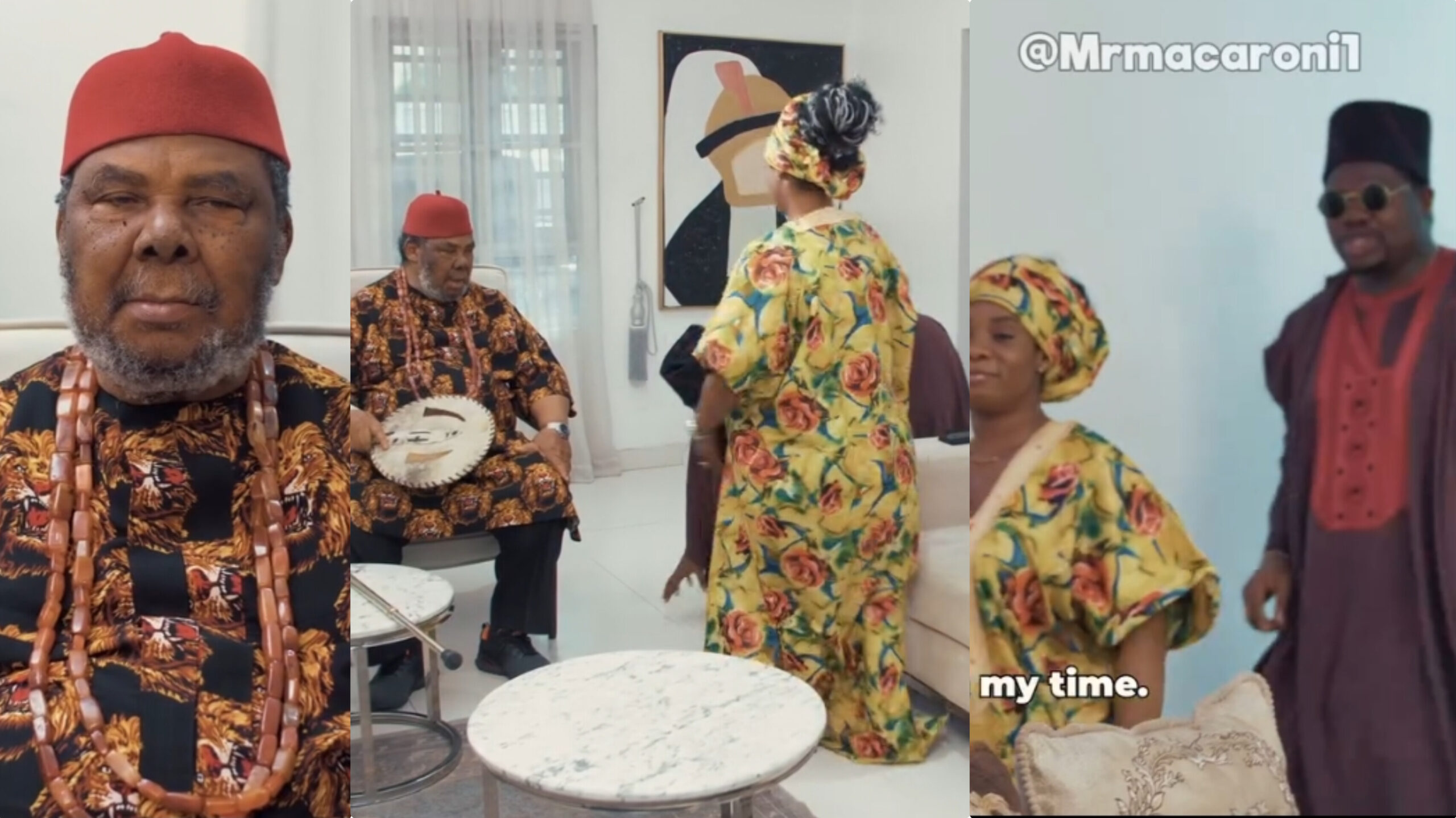 In the skits video Pete Edochie went to seek the hand of marrying Mr Macaroni daughter.