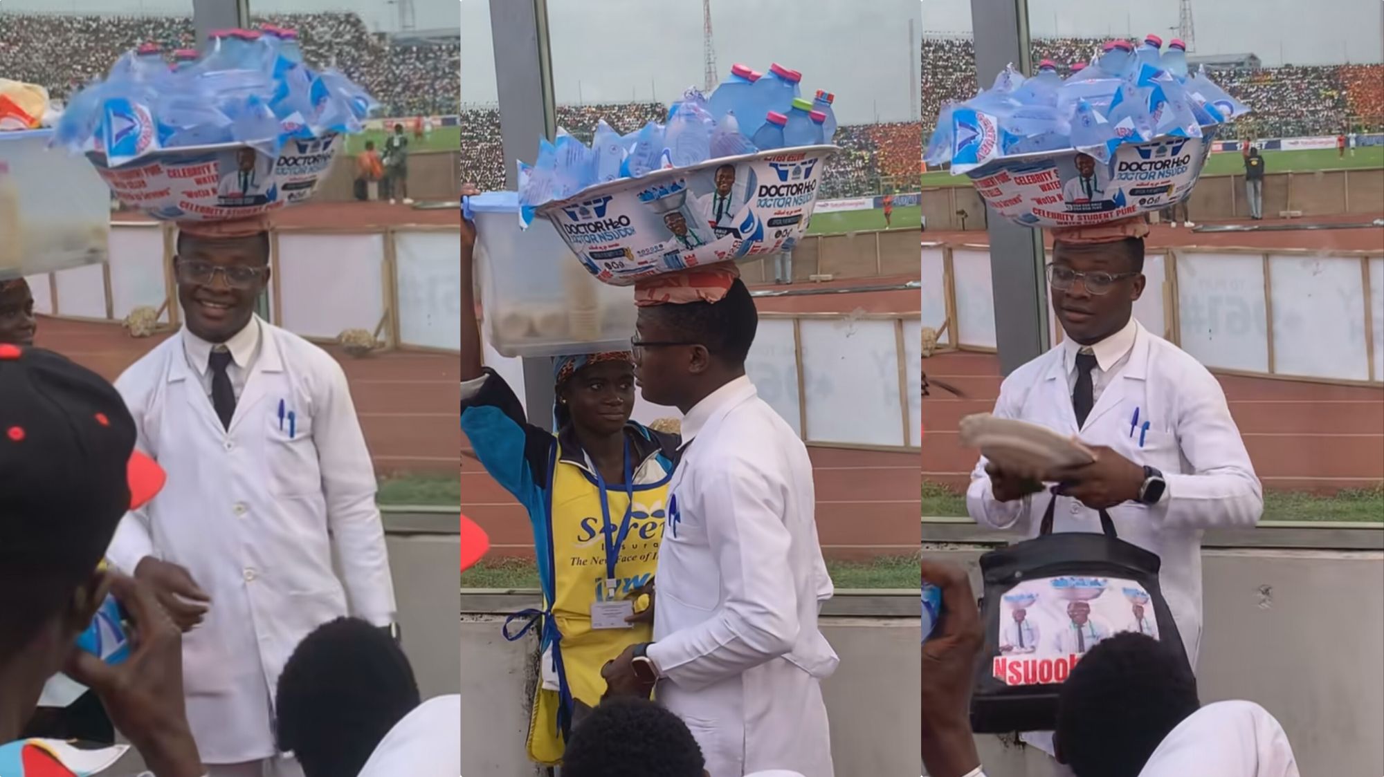 The video, shared widely on social media, shows Doctor H2O selling sachets of water to football fans gathered at a stadium for a match. The TikTok user who posted the clip added a heartfelt caption expressing their admiration and sympathy, noting, “Hmmm, a graduate student is selling water. 😢😢😢😢 Humble self, wai. Comment: it shall be well.”