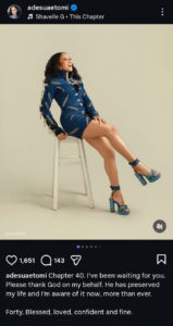 Now a proud mother of two, Adesua described herself as “forty, blessed, loved, confident and fine,” a statement that resonated strongly with many of her followers.
