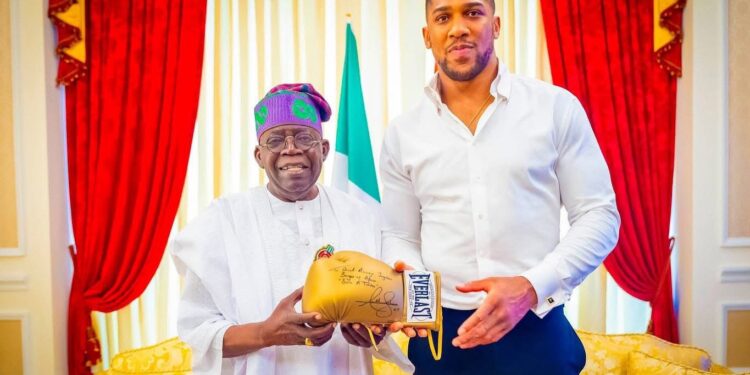 Former heavyweight boxing champion Anthony Joshua recently paid a visit to President Bola Tinubu at his Lagos residence, where he presented him with an autographed glove.