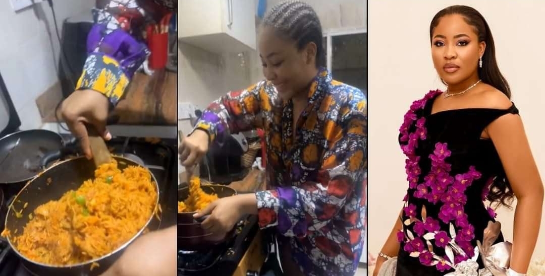 The former BBNaija housemate appeared to be preparing a meal, with fans speculating that it could be jollof rice or abacha.