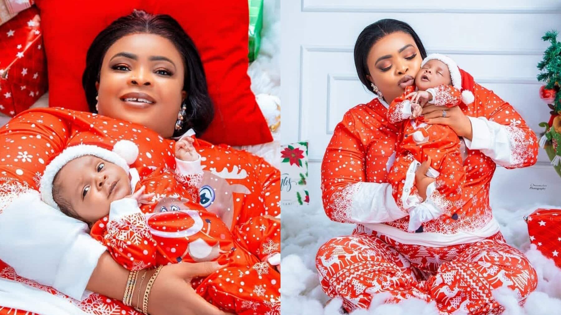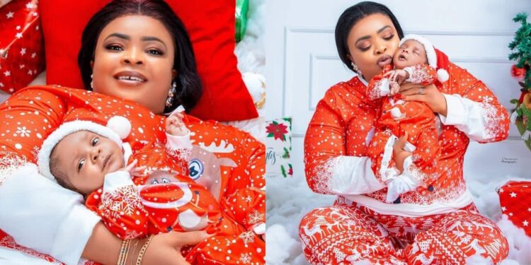 Nollywood actress Dayo Amusa is marking a special milestone – her first Christmas as a mother. The Yoruba actress, who welcomed her first child, a son, just a month ago, took to Instagram to share adorable photos of herself and her baby boy in matching outfits.