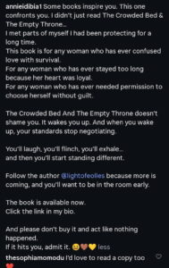 In her post, Annie recommended the book The Crowded Bed & The Empty Throne, describing it as more than just an inspiring read. She explained that while some books motivate you, this one forces you to reflect and face hard truths.