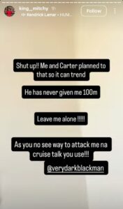 Taking to Instagram, King Mitchy clarified that the ₦100 million claim was never real. She explained that the statement was part of a deliberate plan between her and Carter Efe to make headlines and trend online.