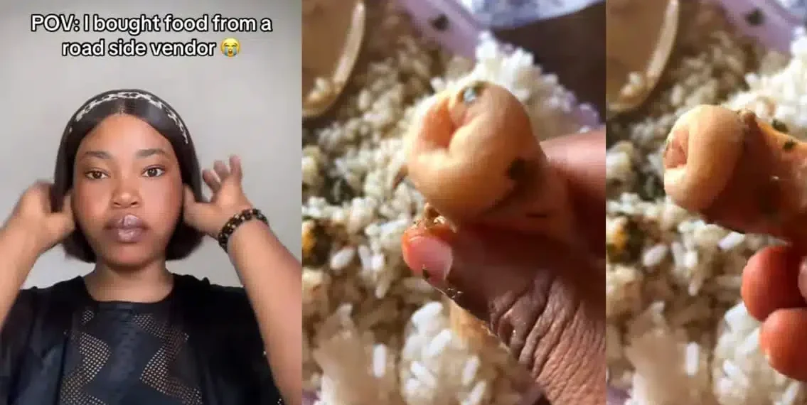 A disturbing discovery has left social media users stunned after a Nigerian lady found a suspicious object in food purchased from a roadside vendor. According to a viral video posted on TikTok, the lady bought the meal from a roadside vendor, only to find an unidentified object lodged within the food. The lady, who seemed visibly shaken, displayed the food and the mysterious object in her hand, expressing uncertainty about what it could be.