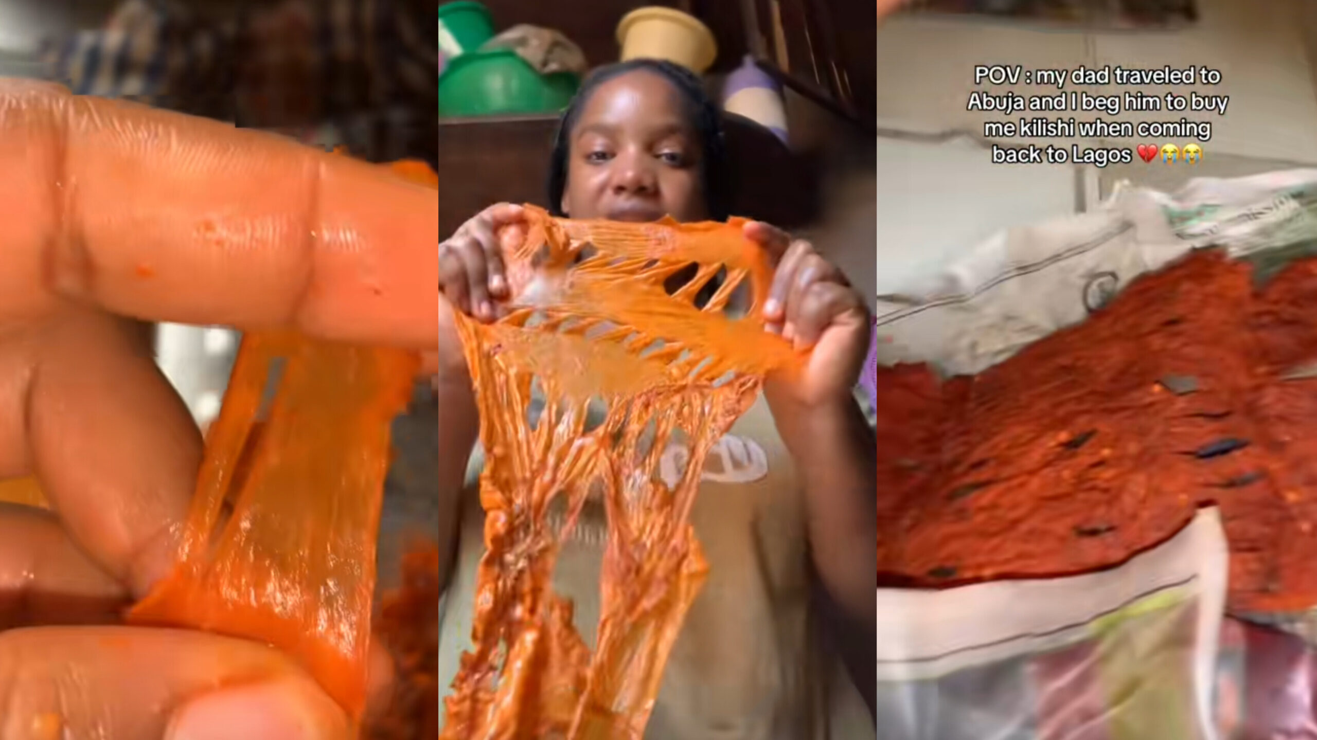 To her astonishment, she discovered that what appeared to be dried meat was, in fact, synthetic rubber coated with suya spice. “My dad travelled to Abuja and I begged him to buy me kilishi when coming back to Lagos,” she captioned the video.