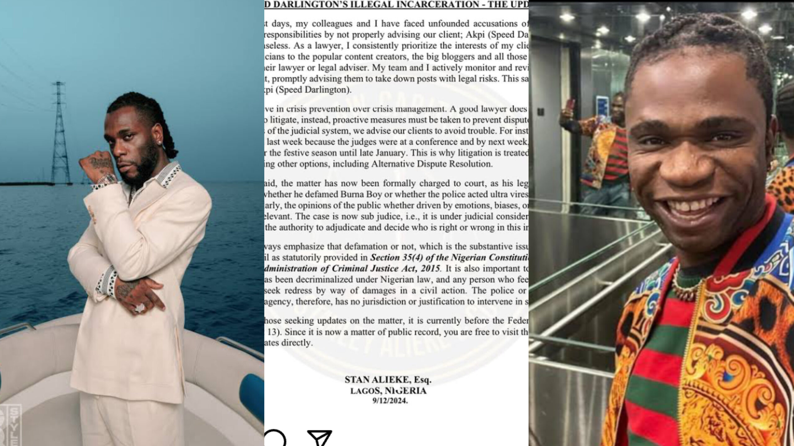 The charges stem from recent remarks made by Speed Darlington, which allegedly tarnished Burna Boy’s reputation.