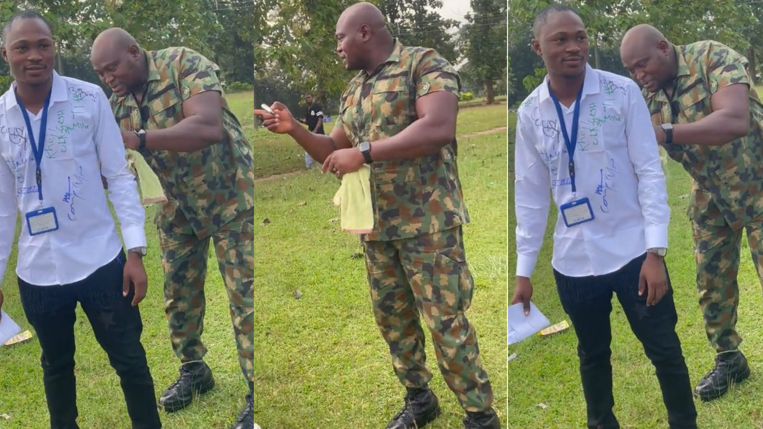 The father who his a soldier came and celebrates with his son as he signout. The man can be seen with joy holding the pen as he signed on his son white shirt.