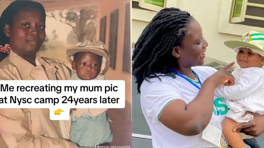 A heartwarming recreation of a 24-year-old photo has gone viral on social media. A youth corps member recreated her mother’s NYSC (National Youth Service Corps) photo, holding her own daughter in the same pose her mother held her in decades ago.