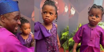 Nollywood actor Adeniyi Johnson and Seyi Edun’s twins stole the show at skitmaker Kamo State’s wedding in Lagos. The twins, recently returned from London, were captured looking uninterested and upset.