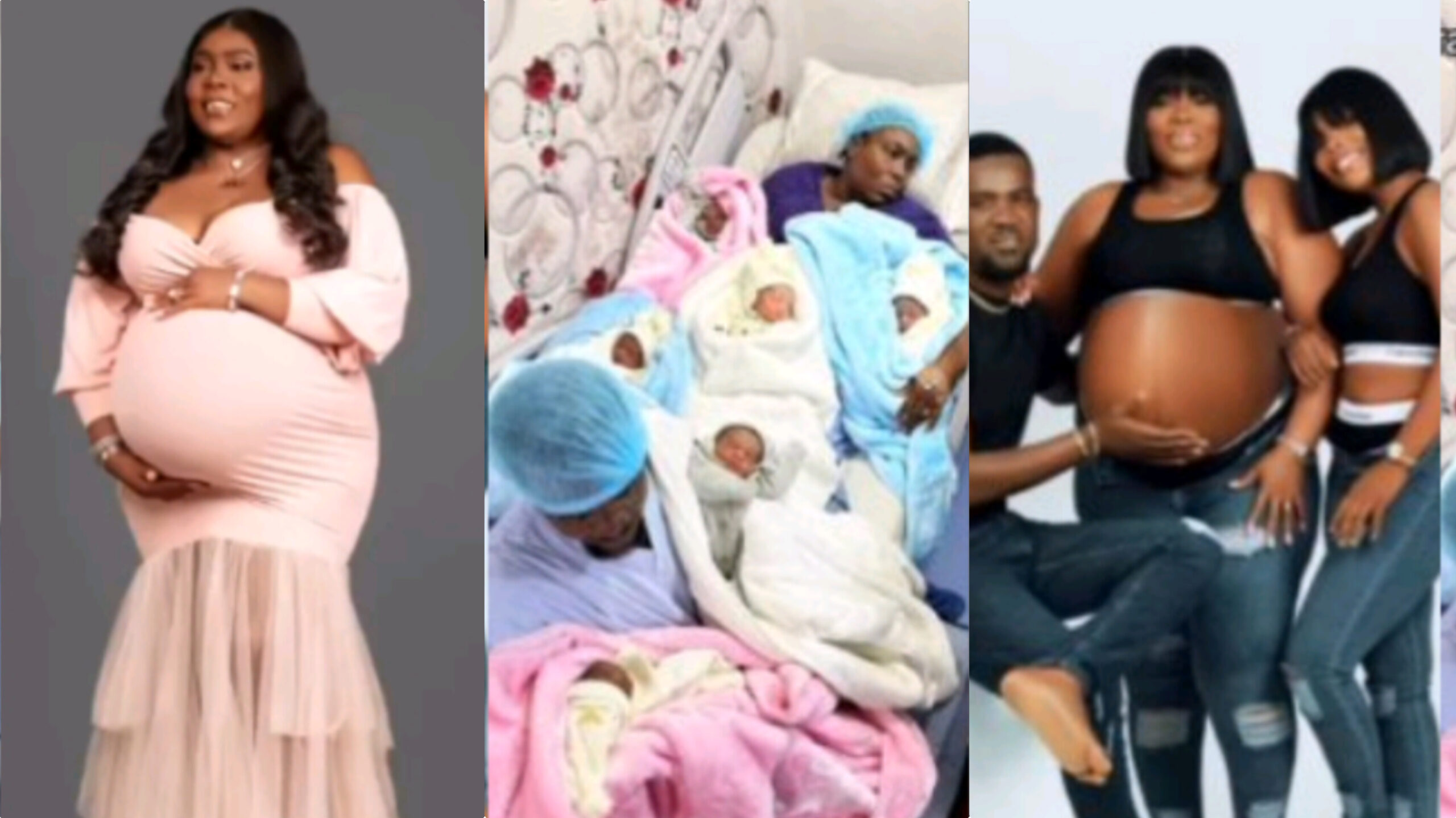 The video begins with a maternity photoshoot featuring the expectant mother, her husband, and their daughter, joyfully anticipating the arrival of the newborns. Later scenes show the mother in the hospital holding four of the babies while her husband tends to the other two.