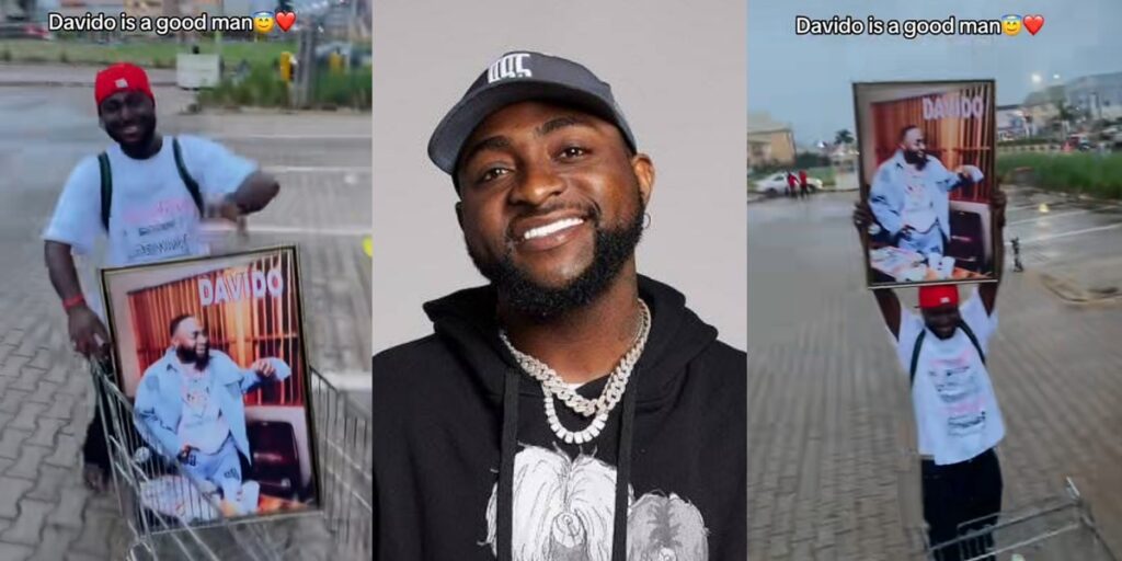 A Nigerian man has gotten Nigerians talking on social media after he was spotted hawking a portrait of Davido in a trolley and also hailing him at the same time. This is contained in a video he made available on his page, showing the moment he placed the portrait of the singer in a trolley.